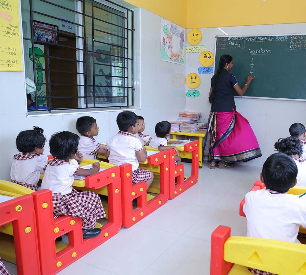 Our curriculum for classes 1 to 5 cover foundational skills across various subjects. In language, they develop reading, writing, and comprehension in English followed by Tamil or Hindi as an additional language. Mathematics covers basic concepts like addition, subtraction, multiplication, division, and simple geometry. Science introduces them to the natural world, including animals, plants, the human body, and basic physics and chemistry principles. Social studies teach about their local community, history, geography, and important Indian culture and traditions. Additionally, art, music, physical education, and moral science help in overall personality development, creativity, and values.