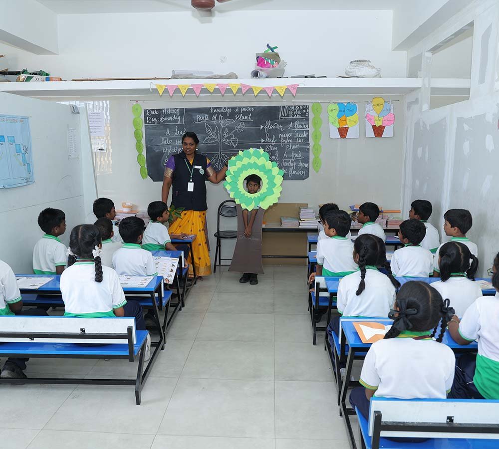 Our curriculum for classes 1 to 5 cover foundational skills across various subjects. In language, they develop reading, writing, and comprehension in English followed by Tamil or Hindi as an additional language. Mathematics covers basic concepts like addition, subtraction, multiplication, division, and simple geometry. Science introduces them to the natural world, including animals, plants, the human body, and basic physics and chemistry principles. Social studies teach about their local community, history, geography, and important Indian culture and traditions. Additionally, art, music, physical education, and moral science help in overall personality development, creativity, and values.